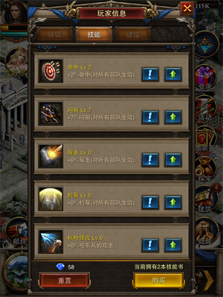 2、升级技能可以增加部队的各种属性,技能最高等级不能超过当前君主等级。每次升级需要消耗当前等级加1的技能书,如当前命中为15级,提升到16级则需要消耗16个技能书。