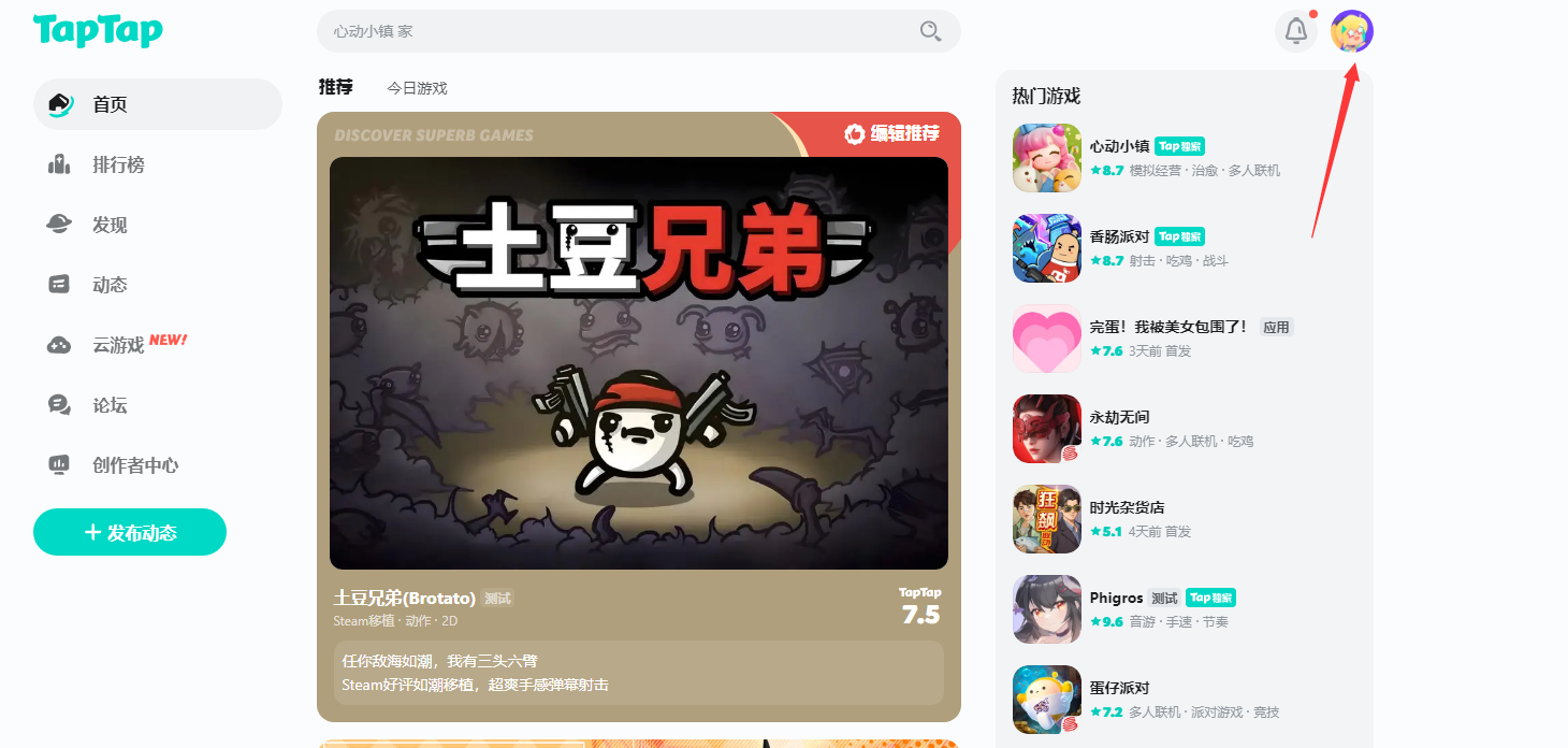 1、打开toptop(taptap)网页https://www.taptap.cn/后,登录要退款游戏的账号,点击右上角的头像