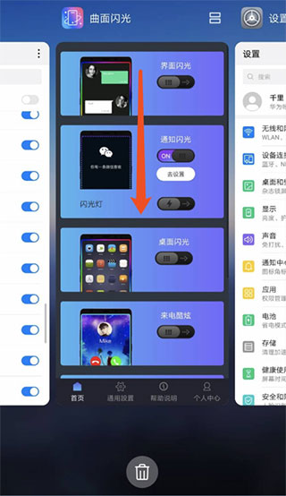 打开曲面闪光以后,默认的闪光都是关闭的,可以选中开关打开相应的功能,打开相应功能的时候,需要开启相关权限,按照程序的提示开启相关权限以后,选择好闪光样式就可以体验酷炫的闪光功能了。