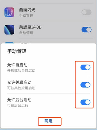 首先点击“手机管家”进入手机管家界面,然后点击“应用启动管理”,然后找到“曲面闪光”,默认是自动管理,点击右边的开关,改为手动管理,此时会弹出一个界面,在弹出的界面里面选中三个选项,点击确定就可以了。