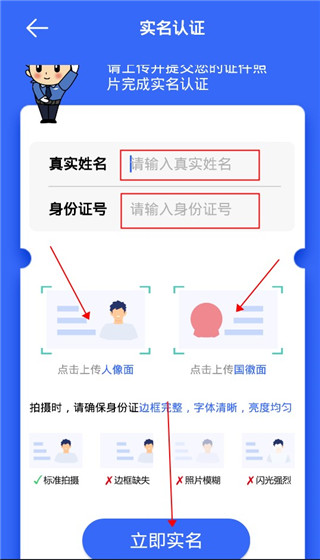 4、输入真实姓名和身份证号码,然后拍摄身份证正反面即可成功认证
