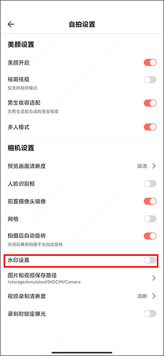 3、再在【相机设置】栏将【水印设置】右侧的开关关闭即可。