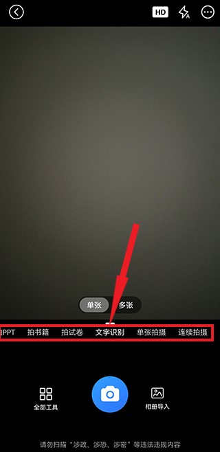 如果用户比较着急,想要快速的扫描文件,可以直接点击下方的相机图标,进入到拍照识别界面,用手机拍下文件的照片就可以快捷识别了,用户可以选择拍书籍、文字识别等多种种类,选择后文件识别的更加准确。
