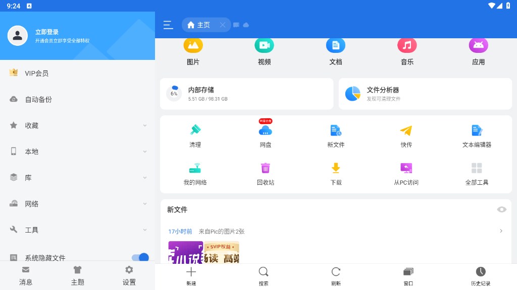 ES文件浏览器无广告版本是ES文件浏览器会员版(专业版),已经为用户免费解锁免登录VIP特权、广告移除、主题包等内容,亲测有效,可放心下载。ES文件浏览器是一款十分安全的安卓手机文件管理工具,该软件界面简洁大方,功能十分全面,通过这软件可以查看压缩包中的文件内容、播放视频影音文件、查看系统隐藏文件等等,非常方便实用。