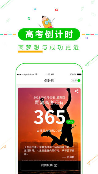 高考倒计时官方最新版app是一款非常不错的生活实用软件。这款软件是专门针对于即将高考或者是一些想要在这里指定计划,管理和规划自己的用户。让每一个用户在这里进行管理和规划自己的时间,让高中学习效率迅速提升!每当用户想要玩游戏的时候就能够使用这款软件开启锁机模式,不到规定的时间是无法解锁使用手机的,让用户能够专心的学习,给用户一个良好的学习状态,想玩也不能玩,就能够专心的学习了,集中精力,学起来才能够事半功倍。更能使考生们许愿立下各种flg,减轻考生们身上的压力,而且还可以规划出合理的复习方案供考生们选择,需要的用户可以来这里下载软件体验一下吧。
