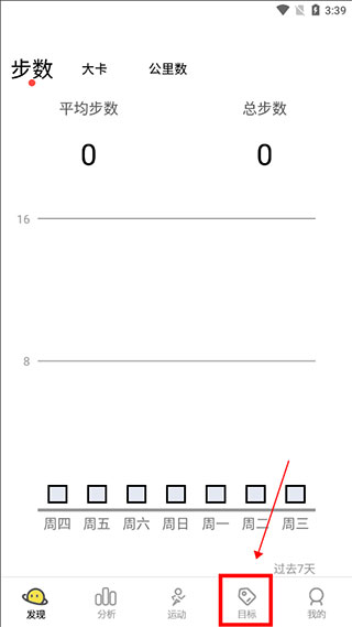 1、下载进入运动健康计步器app,在下方拥有发现、分析、运动、目标、我的四个板块,点击目标;