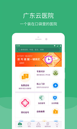 1、在本站下载并安装广东云医院挂号平台官方版,进入首页可以查看软件各项功能。