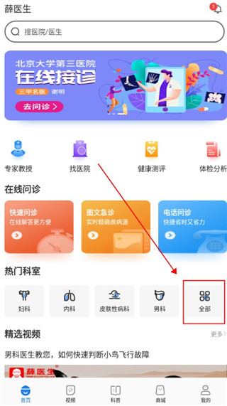 2、然后在主页热门科室点击全部