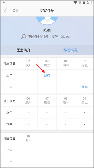 5、点进去一个医生的个人界面,会看到那个医生的排班情况,选择有预约的时间。
