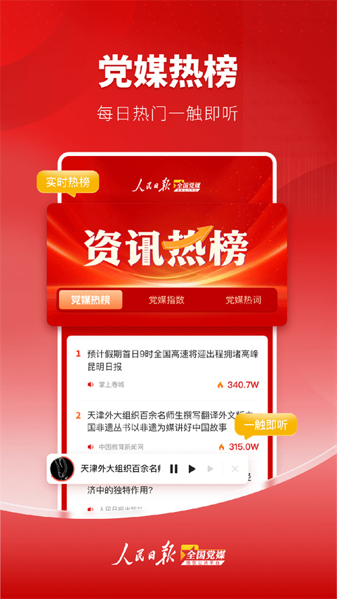 3、【党媒热榜】全新升级的特色栏目专区——整合“党媒热榜”“党媒指数”“党媒热词”特色栏目,上线“听新闻”音频服务。