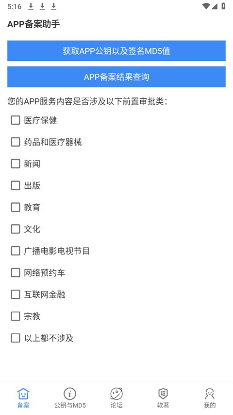 APP备案助手,一款可快速获取APP备案所需填写的签名MD5值与公钥等信息的手机工具。在这里输入应用包名或者应用名称即刻获取到app包名、公钥以及签名MD5值等信息,让你的软件能够更快的获取认可。