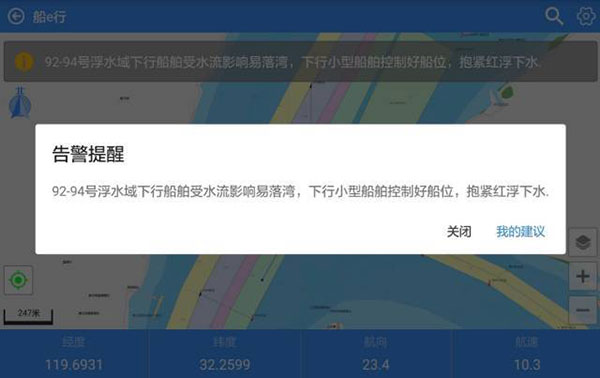 2、船舶航行靠近河口、锚地水域,会语音提示加强瞭望,注意关注船舶动态,避免碰撞。