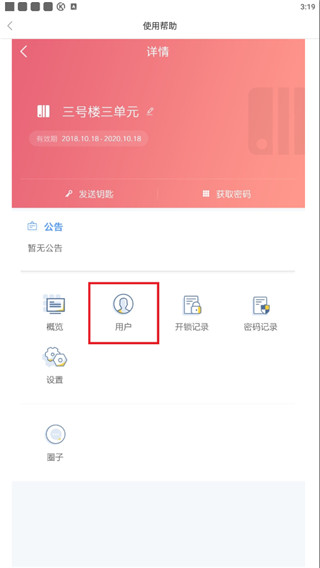 如果电子钥匙身份为“管理员”或“业主钥匙”,则在钥匙详情页“用户”里管理发放出去的钥匙用户。