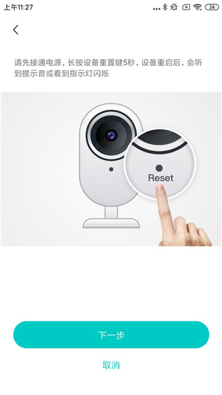 4、连接设备电源,长按设备重置键5秒,设备重启后,会有指示灯闪烁或提示音。