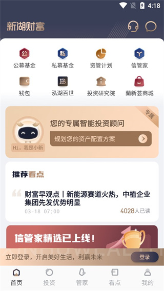 1、首先我们进入新湖财富app,在首页我们可以看到公募基金和私募基金、资管计划和信管家等服务,大家可以根据自己的需求选择;