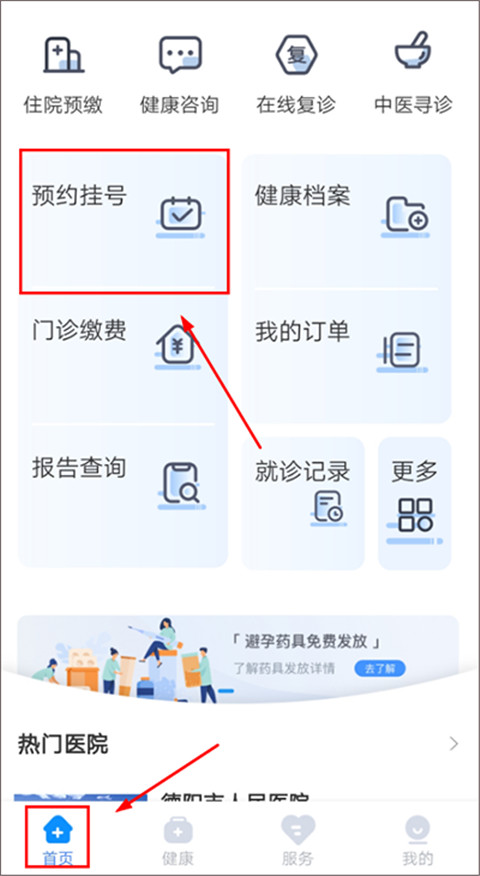 1、打开登录健康德阳app,点击首页内的【预约挂号】