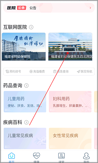 1、进入福建省妇幼保健院app的首页,选择院区。