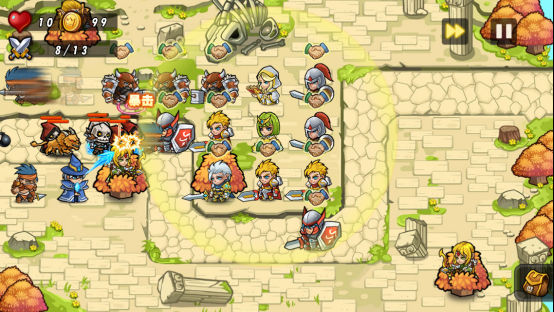 最终阵型:优先把护卫放满,然后升级树上的神射手,再然后优先把护卫旁边的大剑士升出来(护卫旁边boss停留时间长,输出环境好),富余的钱如图把所有剑士连成一片,团结起来!