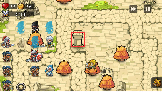 中后期:大概7波之后,在如图位置(前拐角)补两个教士可以压怪物血量,下面两边各补一个大剑士后开始爆巫医,巫医在闪现怪瞬移、潜行怪隐身的时候可以造成高伤害和减速,但是不会主动攻击