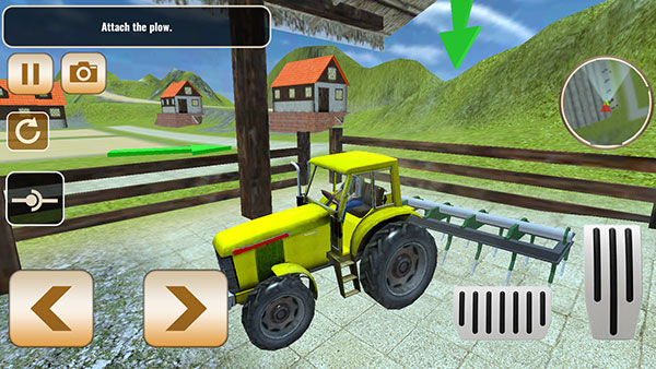 7、点击倒车按钮靠近耕作机器,再点击左侧连接按钮,将其装备上拖拉机。