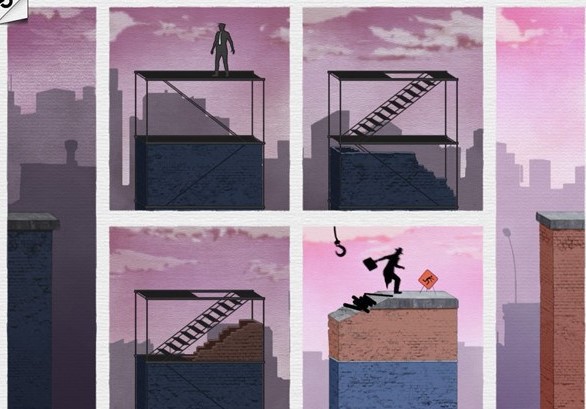 不过我们能够做的唯一一件事就是想方设法让主人公不要走到那块破损的墙壁。方法也很简单,如下图所示调转3、4、5图片的位置即可。这样做有两个好处,一来是主人公在警察上方走过避开了警察的视线,二来直接利用水管滑至下一层而不用去受豆腐渣工程建造商所害。一举两得啊有木有!