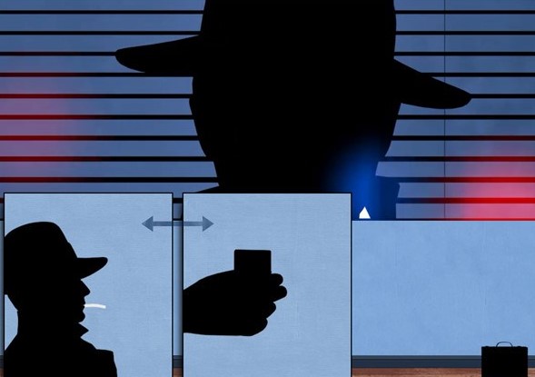 随后来到了第三个场景,倒霉的主人公在众多的房间当中穿梭,却不料RP不好,乱了阵脚,被守株待兔的警察给逮了个正着……如果我们按照下图移动插画的位置,主人公的RP爆表,错过了警察之后便可以从楼梯逃走。小编也不知道怎么回事,自从玩了致命框架攻略之后也忍不住站在了我们的主人公这边,明知与警察作对实则不对,却还是忍不住为逃过一劫又一劫的黑衣人拍手叫好。
