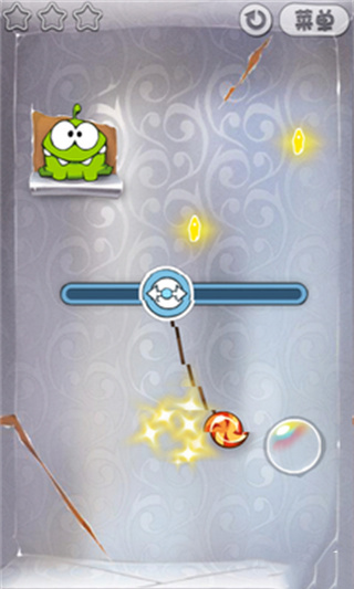 2、泡泡,糖果碰到泡泡的时候会上升,用手指点击泡泡使其破掉,当然了,当糖果飘出屏幕或者掉落出边界游戏就结束了。