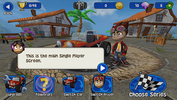 3、如果你玩过前作,就应该知道《沙滩车闪电战》与EA Sports、Gameloft等开发的大作最大不同之处,就在于它将跑酷的规则与竞速玩法有机结合。本作采用的是基于传统RAC规则的赛道制,玩家将要征战8条不同环境风格的赛道,攒够足够多的星星来解锁属于每条赛道的8个赛车事件,最终迎来封关Boss车的挑战,在一对一挑战时间中将其战翻,最终才能进入下一个赛道——想击败这些车猛人更无赖的大坏蛋,光靠技术显然是不行的,需要玩家给加速、最高速度、防护等性能补充营养。作为一部F2P游戏,游戏理所当然地将AI设计得相当强悍,即便是一个简单的6车比赛,想不花钱夹带点“私货”,就很难摆脱老是垫底的悲惨命运。