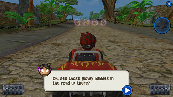 4、采用的是自动加速设计,有3种控制方式供玩家选择,使用默认的重力感应控制方向+全屏制动就有不错体验。油门当然也不是一踩到底(按住竟然还能倒车),漂移过弯前后还是需要一定的刹车技巧,才会保持那种风驰电掣的快感。本作的道具系统完全采用了“卡丁车”的标准,道路上会出现各种各样的Power-ups道具(问号状),而每一个角色也会有各自的专属技能。在关键时刻恰当使用,肯定会助你一臂之力。
