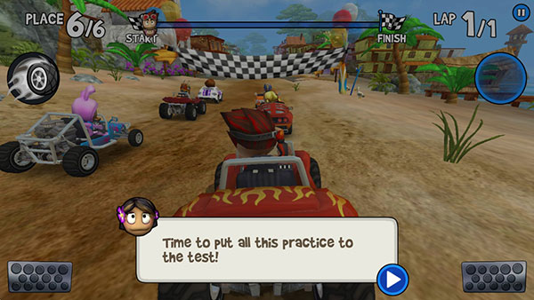 沙滩赛车竞速官方版是一款由知名游戏公司“Vector Unit”开发推出的作品,英文名叫BB Racing,而被广大玩家所熟知的《激流快艇》系列就是出自该公司。而本作延续了“沙滩车”系列的精品路线,玩家将通过12条极其复杂的赛道来完成比赛,其中包括了恐龙曾群居的丛林、岩浆喷涌的火山、阳光普照的沙滩以及神秘的沼泽等极具特色的线路,同时每条线路都分布着秘密的捷径小道,各种神奇的道具散落其间,可满足你加速、猛冲以及弹射驾驶员等各种需求。此外,沙滩赛车竞速的游戏画面虽然略显粗糙,但是这并不妨碍它的游戏美术的优秀,制作组对于游戏细节的刻画却丝毫没有马虎,比如说赛车开到水中会有水花飞溅的效果,如果撞到箱子还会撞出藏在箱子中的鸡,这些细节特效都充分说明了制作组是非常有诚意的制作了这款游戏。而且本作的赛车升级系统基本上延续了常规的设定,由于游戏是道具类卡丁车,经常会吃点导弹啊,粘液之类的,所以还有一项额外设定就是防御值。当然,只要玩家的赛车技术过硬,导弹什么的完全不够看的,而这的前提就是将游戏的AI设置成为偏低哦,不然还是会把你累的够呛的!