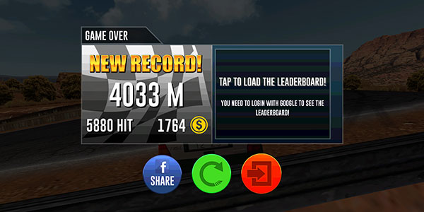 7、取消继续之后会显示玩家的总里程数和奖金,点击绿色按钮重新挑战,或者红色按钮返回主界面。