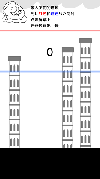 破坏巴别塔最新版是由SleepingMuseum开发的一款有趣的休闲益智类游戏。游戏的整体画风清晰简单,在游戏体验上,玩家在游戏中需要通过落雷来击毁房屋,随着塔的上涨你则需要在蓝色线和红色线之间将其消除,而只有当塔顶触碰红色线条之时才能获得最高的积分