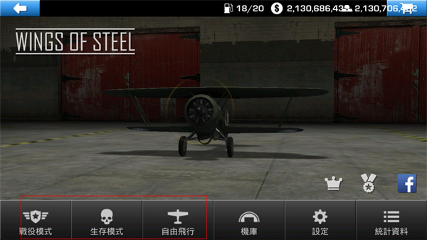 1、首先打击进入游戏可以看到三种模式:战役模式、生存和自由飞行,点击机库可以更换飞机。