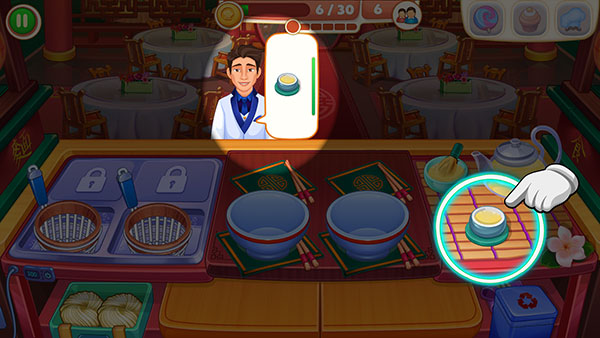 2、之后是教学关卡,我们迎来了第一位顾客,他头顶的气泡显示的就是他的点餐内容。