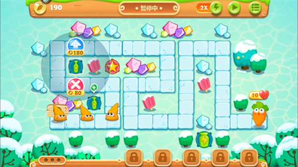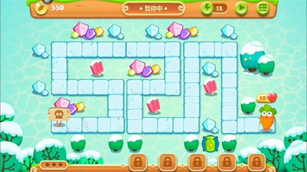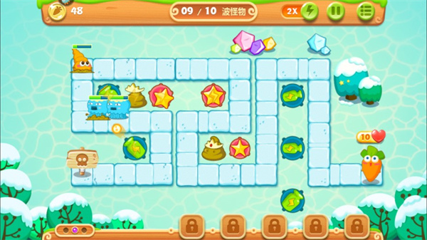 9、如果萝卜被咬了10口则会游戏失败,所以玩家尽可能的要多建造炮塔;