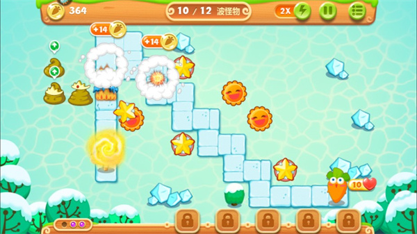 1、保卫萝卜2国际服操作十分简单,只需点击地图中闲置区域就可以安置炮塔。