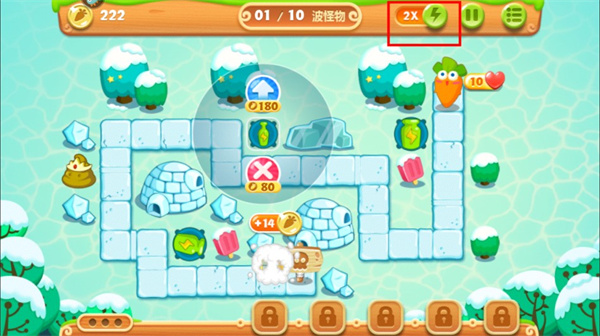 9、如果萝卜被咬了10口则会游戏失败,所以玩家尽可能的要多建造炮塔;