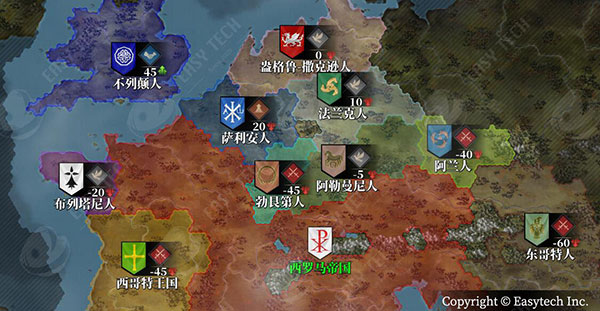 本作外交关系将分为:战争、和平、通行、同盟。游戏内玩家所选国家与其他国家的外交关系会以外交关系图标、外交值、外交态度的形式直接显示在大地图上,玩家可以更直观、更快捷的思考采取何种外交政策。