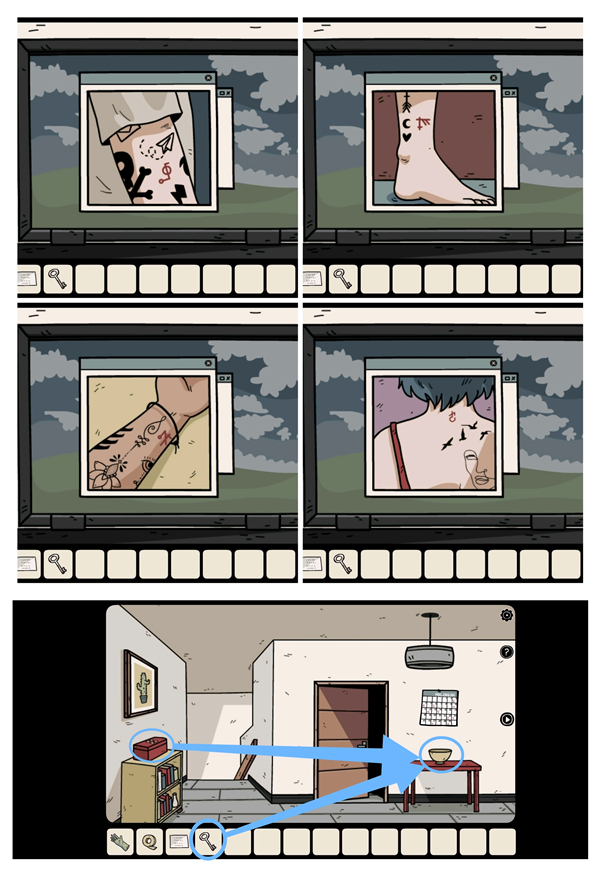 打开笔记本观察四张照片(注意数字和数量),再到二楼第一房间门口结合日历获得四个「符号」。