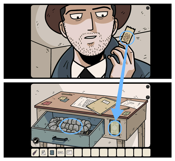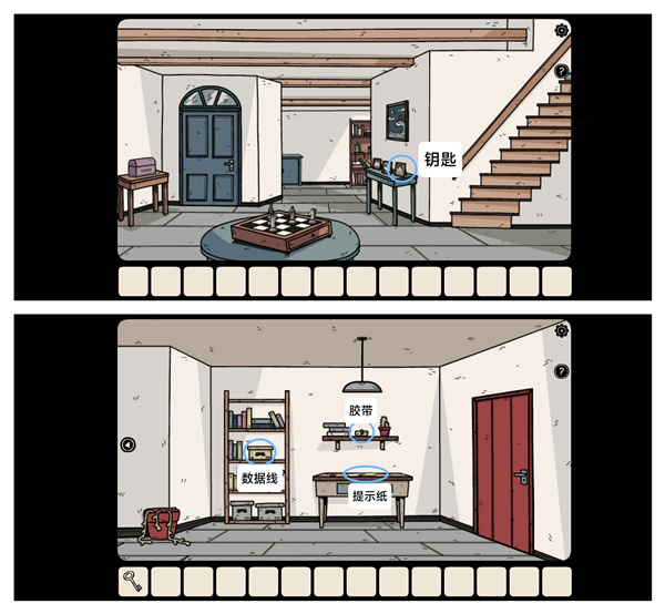 拿走相框背后的「生锈的钥匙」,再到二楼右侧拿走「数据线」、「胶带」以及「提示纸」。