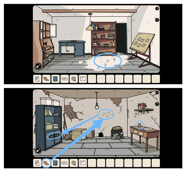 到二楼右侧房间用扳手卸下扫描仪的电源盖再装上电池,然后根据纸条上的提示依次扫描四件道具获得四个「符号密码」,最后打开左上方的柜子拿到里面的「砂纸」和「面粉」。