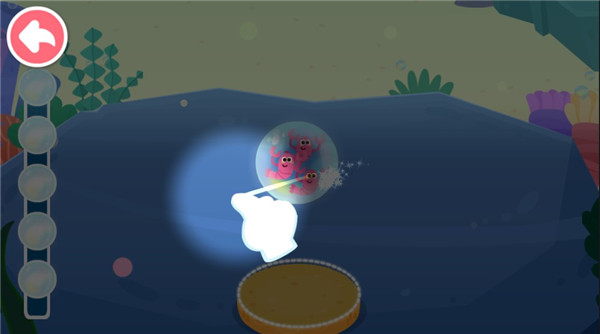 落石清理完毕,接下来就该进入洞窟,寻找水母宝宝啦!寻找时,宝宝可要注意安全:前方有礁石,绕开它才不会撞晕;洞窟中还有电鳗出没,宝宝快躲开!瞧,终于找到水母宝宝啦。