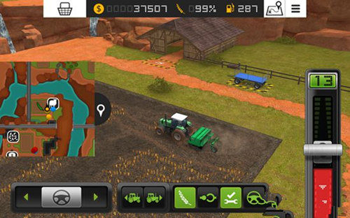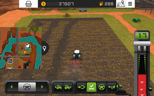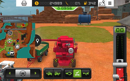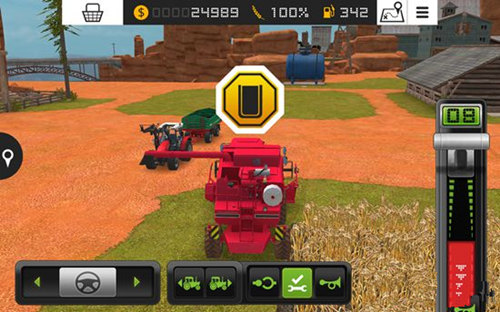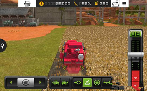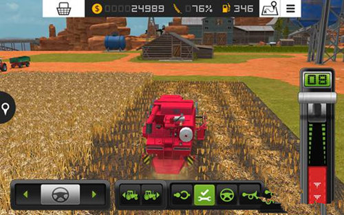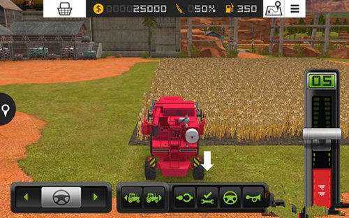 1、游戏中我们要控制各种农用车辆和工具来工作,首先就是控制收割机,将屏幕右边的推杆向上推,收割机就会向前行动,推杆向下推到红色区域,收割机就会后退。