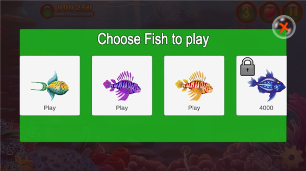 分标准准备和时间模式,各60关,玩到后机要不停的追BOSS鱼,最终把BOSS鱼消灭后,就可以选这条鱼了。