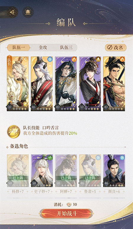 四个伤害最高的输出(最好是单体)+一个盾(这里用的1w血颜良)。