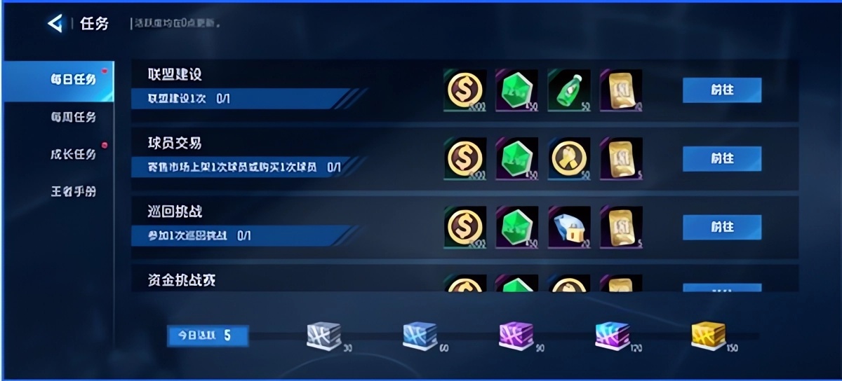 随着俱乐部等级的提升,可以开启的玩法更多,每日可做任务也会随着玩法而增加。经理人们可以通过每日/每周任务获得大量道具,任务每日/每周刷新,经理人们要按时完成。任务可以获得等道具,完成登录、指定赛事、副本等任务即可获得,完成任务可以获得活跃度,达到指定活跃度可以开启宝箱,经验、宝箱、运动饮料、绑钻等道具轻而易举就可以拿到。不仅如此,每日任务系统也是经理人们了解游戏各种玩法的小捷径,落下哪个没做,看一下任务就可以快捷前往,很方便。