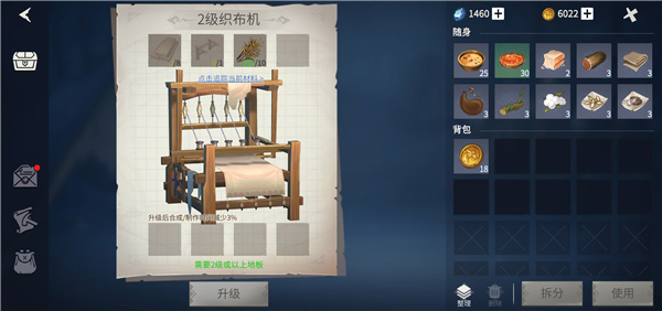 3、成功击败boss采集到松木之后,我们就可以回到营地制作原材料提升木工台和织布机的等级了,这里需要跟大家解释一下,我们营地中的每一个建筑都是可以通过材料提升等级的。像木工台升级到2级之后我们就可以制作松木板、简易支架等新的道具,而升级织布机也会需要用到这些原材料。