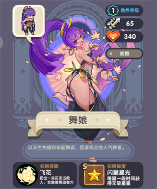 舞娘也是比较强力的职业的,能够扔出一朵随着移动变大的飞花,持续的伤害敌人,并且初始秘宝是能够获取打无敌的状态,也是非常强力的效果的。在后期怪物多了以后,无敌的时间就显得非常的重要了。