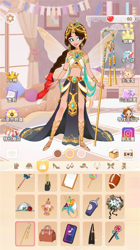 2、进入游戏可以随意给公主进行装扮,不管是头发、头饰、裙子、衣服、裤子、鞋子、包包、耳环、项链等通通都可以免费搭配;
