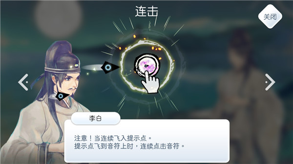 通过点触、滑动、拖曳的操作,并且融合书法文字元素,玩家可通过手指描绘书法字完成演奏。上百种各种难度的华丽谱面,满足不同玩家需求。